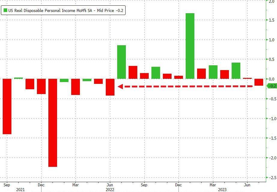 支撑消费者支出的实际可支配收入环比下降0.2%,为2022年6月以来最大降幅。