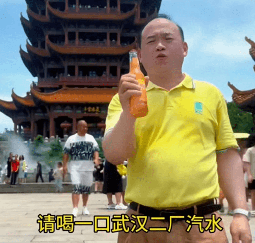 他抖音至今置顶的视频:站在人来人往的黄鹤楼前,他将橘红色的汽水一饮而尽,背后那块牌匾上“气吞云梦”四个大字,恰与他遥相呼应。