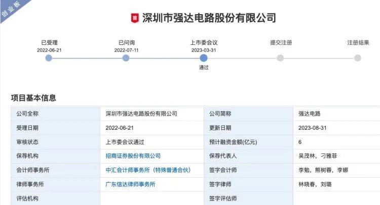 深圳证券交易所网站显示,深圳市强达电路股份有限公司(以下简称“强达电路”)8月31日发布第二轮问询函回复,并更新2023年半年度财务数据。IPO进程显示,强达电路于2022年6月21日已受理,拟创业板上市,2023年3月31日首发获通过。本次发行的保荐机构为招商证券。