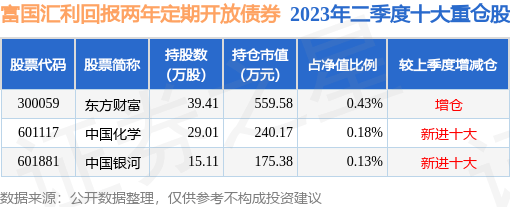 富国汇利回报两年定期开放债券为债券型-混合债基金,根据最新一期基金季报显示,该基金资产配置:股票占净值比0.75%,债券占净值比138.7%,现金占净值比2.37%。基金十大重仓股如下: