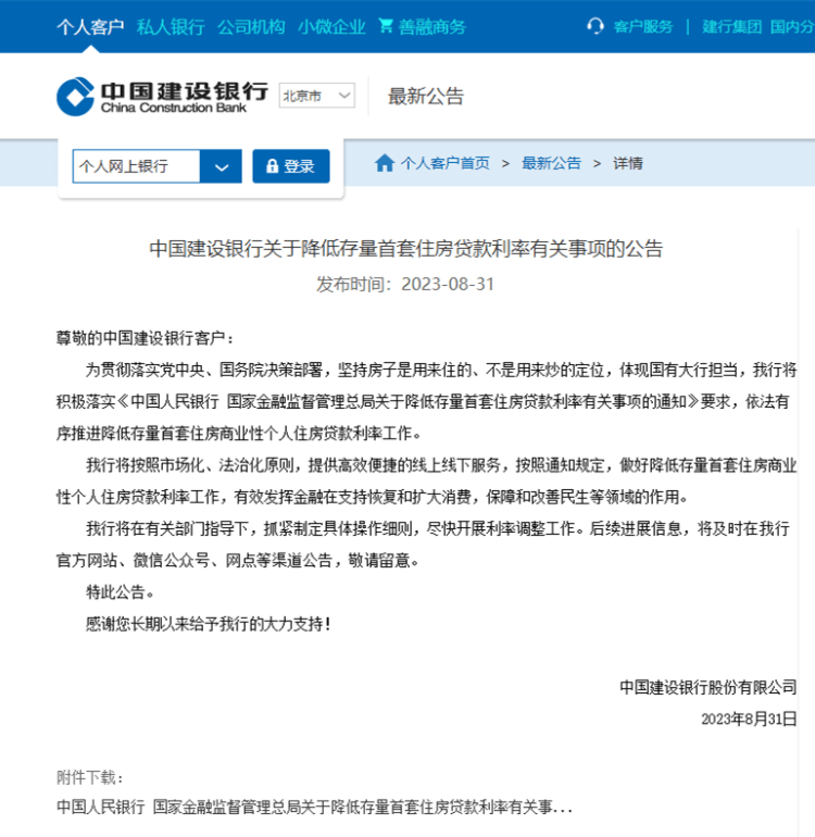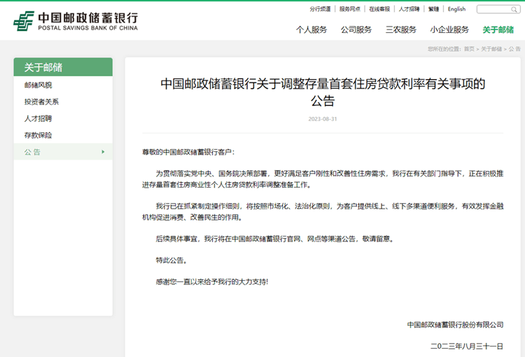 截至31日晚发稿,中国邮政储蓄银行、农业银行、建设银行和招商银行相继发布了关于调整存量首套住房贷款利率的公告,称将积极依法有序开展存量首套房贷利率调整准备工作,在有关部门指导下,抓紧制定具体操作细则,按照市场化、法治化原则,通过线上、线下多渠道提供便利服务,依法合规开展好利率调整工作。
