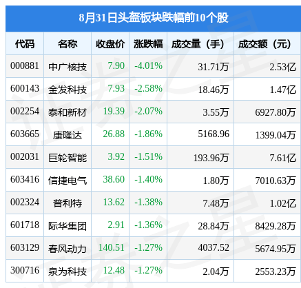 8月31日头盔板块较上一交易日下跌0.34%,中广核技领跌。当日上证指数报收于3119.88,下跌0.55%。深证成指报收于10418.21,下跌0.61%。头盔板块个股涨跌见下表: