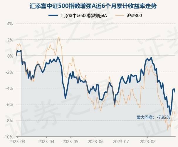 8月31日,汇添富中证500指数增强A最新单位净值为1.4947元,累计净值为1.7597元,较前一交易日下跌0.51%。历史数据显示该基金近1个月下跌4.14%,近3个月下跌0.4%,近6个月下跌4.63%,近1年下跌3.58%。该基金近6个月的累计收益率走势如下图: