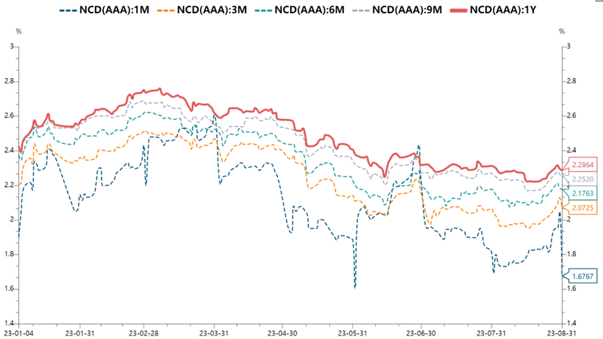 国有和主要股份制银行一年期同业存单二级市场最新成交集中在2.29%附近,较上日降下行2bp左右。