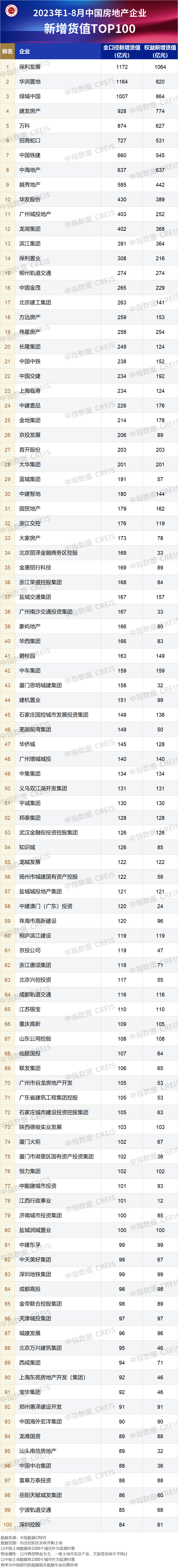 从新增货值来看,保利发展、华润置地、绿城中国占据榜单前三位。2023年1-8月,保利发展以累计新增货值1172亿元占据榜单第一;华润置地、绿城中国紧随其后,累计新增货值规模分别为1164亿元和1007亿元。TOP10企业2023年1-8月新增货值总额8184亿元,占TOP100企业的37.6%,新增货值门槛为84亿元。