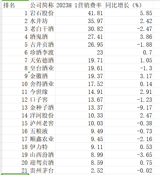 财报显示,岩石股份(上海贵酒)、水井坊、老白干酒、酒鬼酒、古井贡酒、珍酒李渡排在营销费率占比前列,销售费率都在20%以上。其中,老白干酒、水井坊超过30%,上海贵酒更是高达41.81%,属于烧钱赚吆喝的典型。