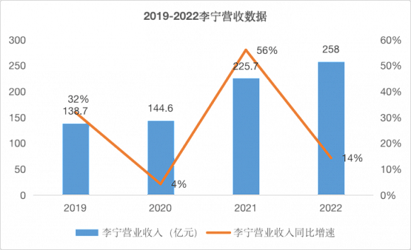 积极投入咖啡和快闪店布局的李宁,财务数据也并不好看。2021年,短暂剥离了疫情的影响后,触底反弹的李宁在当年实现225.7亿元营收,同比增长56%。然而,到了2022年,其增速明显放缓至14%,是近四年除了疫情爆发当年以外,增速最慢的一年。