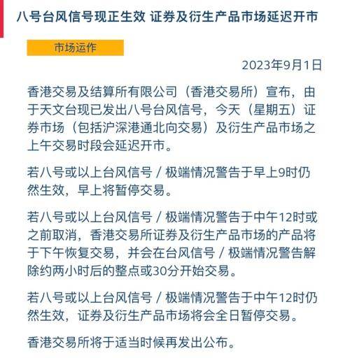9月1日早间,香港交易所宣布,由于天文台现已发出八号台风信号,今天证券市场(包括沪深港通北向交易)及衍生产品市场之上午交易时段会延迟开市。