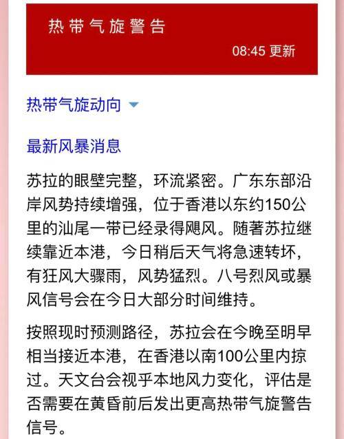 截至8时45分,香港天文台已发出八号烈风或暴风信号,并表示这一信号会在今日大部分时间维持。按照现时预测路径,“苏拉”会在今晚至明早相当接近香港,在香港以南100公里内掠过,香港天文台也会根据本地风力变化,考虑是否需要发出更高热带气旋警告信号。