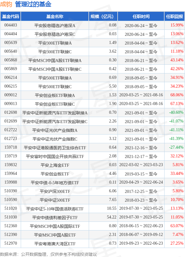 成钧先生:上海交通大学博士,南京大学和上海证券交易所博士后,曾任职于上海证券交易所、国泰基金管理有限公司、嘉实基金管理有限公司、中国平安人寿保险股份有限公司。2017年2月加入平安基金管理有限公司,现任平安沪深300交易型开放式指数证券投资基金(2017-12-25至今)、平安中证500交易型开放式指数证券投资基金(2018-03-23至今)、平安沪深300交易型开放式指数证券投资基金联接基金(2018-04-04至今)、2018年6月15日至2022年6月23日任平安MSCI中国A股国际交易型开放式指数证券投资基金、平安MSCI中国A股国际交易型开放式指数证券投资基金联接基金(2018-06-21至今)、平安中证500交易型开放式指数证券投资基金联接基金(2018-09-05至今)、平安创业板交易型开放式指数证券投资基金(2019-03-15至今)、平安中证5-10年期国债活跃券交易型开放式指数证券投资基金(2019-07-30至2023-05-25)、平安中债-中高等级公司债利差因子交易型开放式指数证券投资基金(2019-07-30至今)、平安中证粤港澳大湾区发展主题交易型开放式指数证券投资基金(2019-09-23至2022-06-23)基金经理。曾管理的基金名称及管理时间:平安MSCI中国A股低波动交易型开放式指数证券投资基金(2018-06-07至2019-09-12)。2020年3月25日至2021年8月16日任职平安创业板交易型开放式指数证券投资基金联接基金基金经理。2020年4月29日任职平安中债-0-5年广东省地方政府债交易型开放式指数证券投资基金基金经理。2020年6月24日任职平安股息精选沪港深股票型证券投资基金基金经理。2021年9月1日担任平安中证光伏产业指数型发起式证券投资基金基金经理。2021年9月1日担任平安中证新能源汽车产业交易型开放式指数证券投资基金发起式联接基金基金经理。2019年7月30日至2023年5月25日担任平安中债-中高等级公司债利差因子交易型开放式指数证券投资基金基金经理。