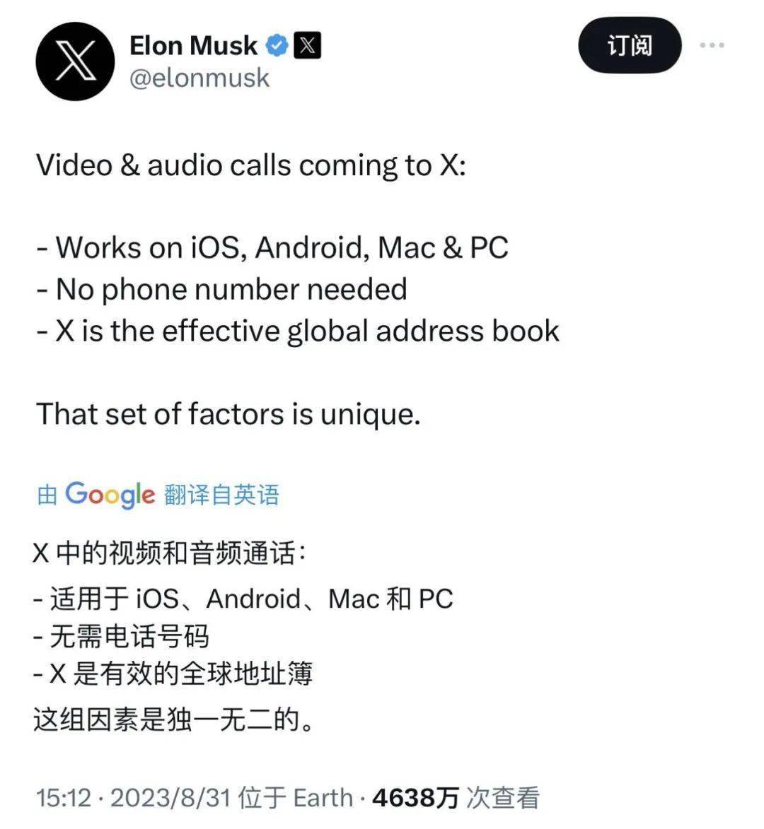 此外,马斯克昨日宣布,X 平台将推出视频和音频通话功能,该功能将适用于 iOS、Android、Mac 和 PC。