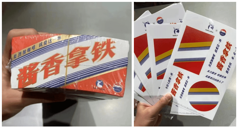 目前杯套、纸袋的剧透图已流出,上面标注「中国人的第一杯酱香拿铁」和「美酒加咖啡,就爱这一杯」。