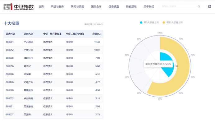 截至2023年8月31日,该指数前十大权重股包括中芯国际、中微公司、澜起科技、寒武纪、华润微等,前十大权重股合计占比57.26%。(数据来源:中证指数公司,指数成份股不代表个股推荐)