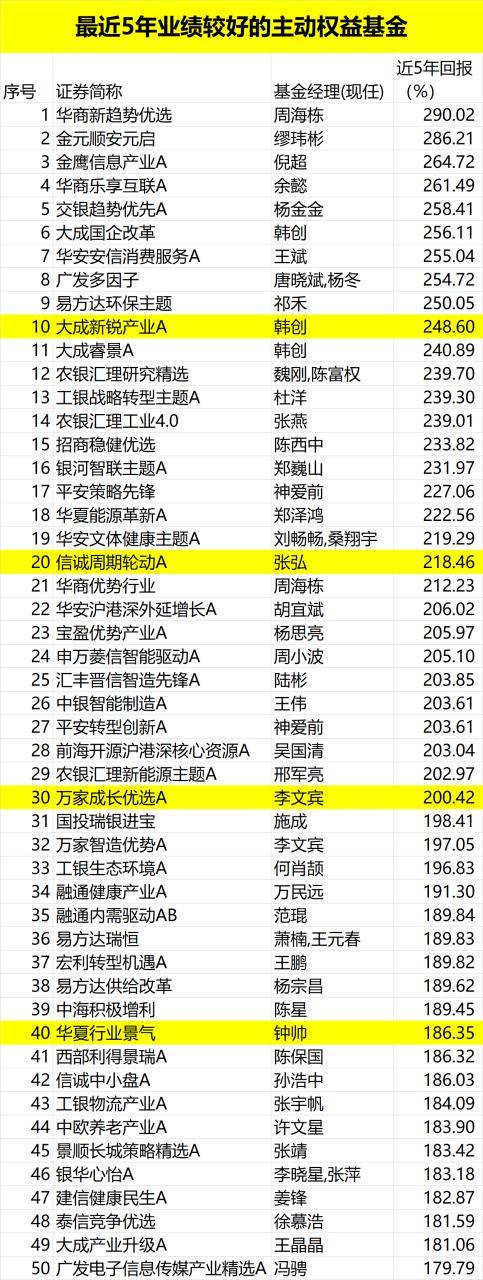 从近五年的情况看,周海栋管理的华商新趋势优选业绩回报达到290.02%,在主动权益基金中排列第一。紧随其后的是缪玮彬管理的金元顺安元启,近五年业绩回报也达到了286.21%。