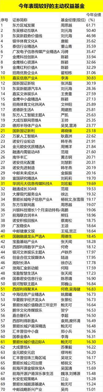 此外,金鹰信息产业、华商乐享互联、交银趋势优先、大成国企改革、华安安心消费服务、广发多因子、易方达环保主题等基金也表现较好。也涌现出一批如倪超、唐晓斌、杨金金、韩创、祁禾、刘畅畅、郑巍山、杜洋、陆彬、万民远、高兵、神爱前、崔宸龙等优秀基金经理。