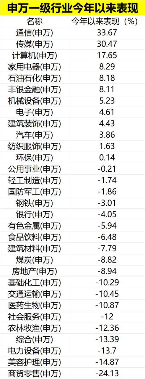 在主流指数纷纷回撤的背景下,仍有一些热门的行业赛道表现较好。从申万一级行业来看,今年以来一度备受追捧的通信、传媒、计算机等指数均出现超15%以上的上涨,涨幅分别达到33.67%、30.47%、17.65%,家用电器、石油石化、非银金融等也表现较好。