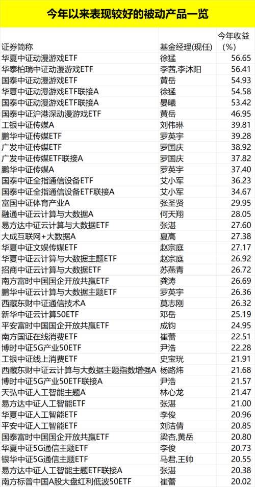 业内人士表示,过去两三年的结构性行情中,医药、消费、科技、新能源等领域成为公募基金主要布局方向,集中了较多的筹码,而今年主要是传媒、游戏、云计算、大数据、人工智能等领域表现较好,而此前公募主动权益基金布局并不多,因此整体被动型产品表现更好。
