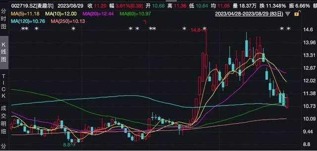 如今一年过去,8月29日,麦趣尔(002719.SZ)半年报公布。截至8月31日,麦趣尔报收11.28元/股,总市值19.64亿元。