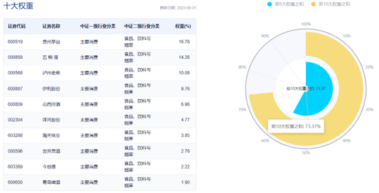 数据显示,截至2023年8月31日,该指数前十大权重股分别为贵州茅台、五粮液、泸州老窖、伊利股份、山西汾酒等,前十大权重股集中度为73.37%。