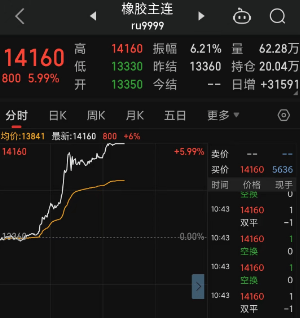 截至发稿,焦煤主力合约日内涨幅扩大至7%,现报1635元/吨。焦炭主力合约日内涨幅近5%,现报2339.5元/吨。20号胶(NR)主力合约触及涨停,涨幅5.98%,报10630元/吨。橡胶主力合约触及涨停,涨幅为5.99%,报14160元/吨。BR橡胶主力合约也是涨停状态。