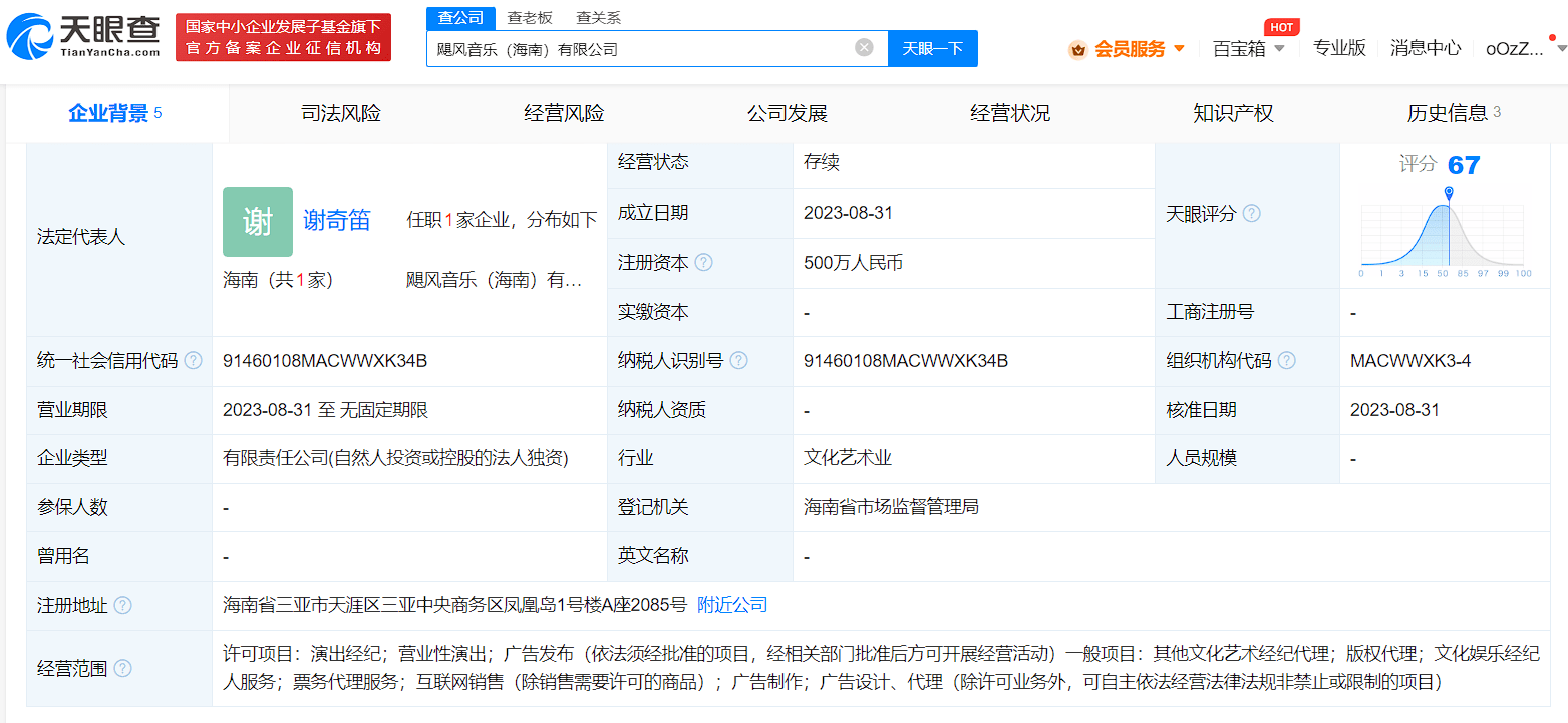 天眼查App显示,近日,飓风音乐(海南)有限公司成立,法定代表人为谢奇笛,注册资本500万人民币,经营范围含演出经纪、营业性演出、文化娱乐经纪人服务、票务代理服务、互联网销售等。股东信息显示,该公司由杭州网易云音乐科技有限公司全资持股。