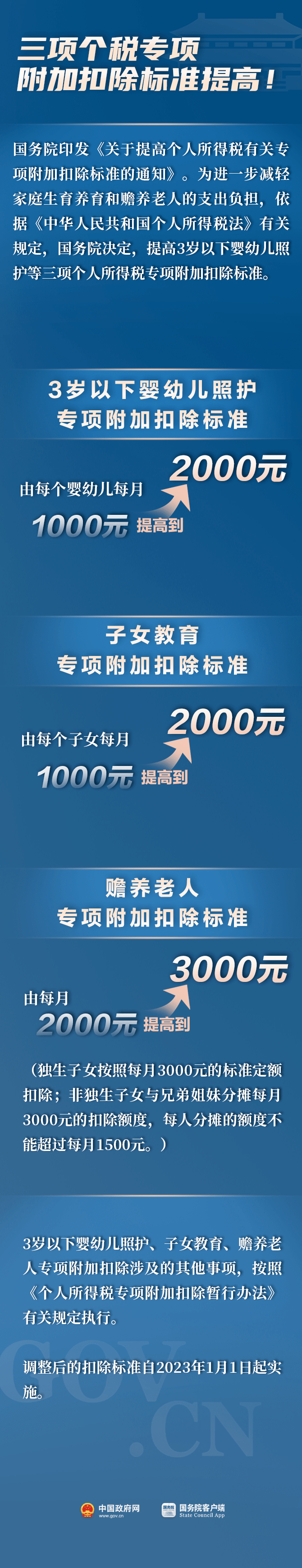 国务院发布提高个人所得税有关专项附加扣除标准的通知,通知全文如下: