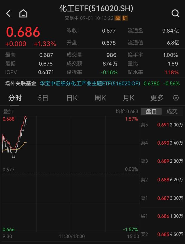 场内代表ETF方面,化工ETF(516020)场内价格早盘触底上冲,截至发文涨幅扩大至1.33%,成交额近700万元。