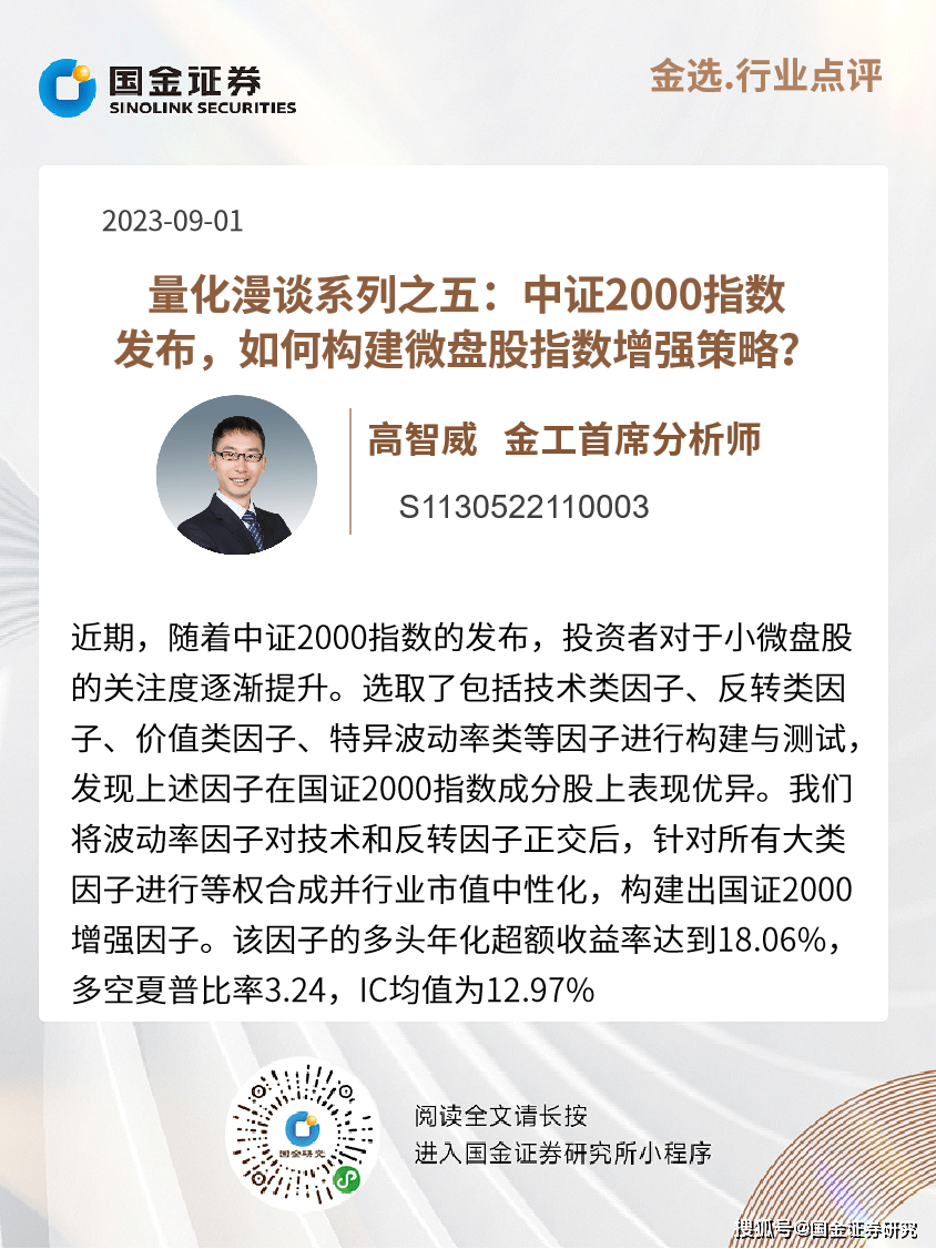 对于想要投资小微盘股的投资者来说,如何获取超越指数的Alpha收益是大家比较关心的问题。由于国证2000指数与中证2000指数成分股有一半左右的重合度,因此因子的表现特征应与中证2000指数中类似。本篇报告中我们结合小微盘股的主要特征,结合过往研究经验中发现的小微盘股有效因子。选取了包括技术类因子、反转类因子、价值类因子、特异波动率类等因子进行构建与测试,发现上述因子在国证2000指数成分股上表现优异。这与大家的“小微盘股价量类因子更有效,大盘股基本面因子更有效”的经验保持一致。我们针对其中有效的细分因子进行合成后,合成的大类因子效果得到进一步提升。其中反转因子的IC均值为9.81%,多头年化超额收益率为11.92%,技术因子12.60%,多头年化超额收益率为12.60%,特异波动率因子IC均值10.55%,多头8.12%。价值因子IC均值为7.02%,多头9.09%,且因子的多空夏普均在1以上。