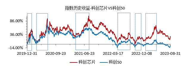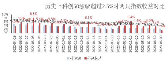 其次,对比历史上每一轮科创板反弹,用科创芯片和科创50指数做对比可以看出,科创芯片都是要优于科创50,如下图: