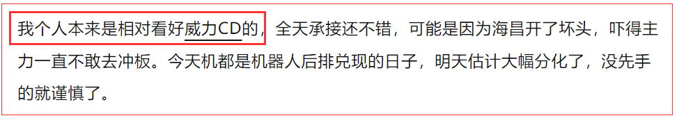 襄阳ZC涨停的时候,我低吸了一只连阳的机器人票,就是昨天讲过的威力CD,可惜写文的时候襄阳ZC炸板了,瑟瑟发抖ing。