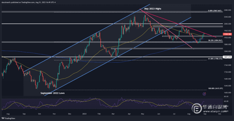 金价在8月下旬上涨,收复了200日和50日简单移动均线。然而,在本月结束前,黄金的上行势头有所减弱,恰逢价格遭遇短期趋势线阻力。