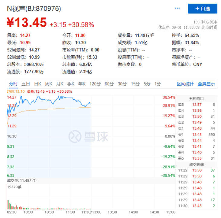 N视声上午开盘涨11.8%,盘中涨幅最高近39%,价格最高达到14.27元/股,发行价为10.3元/股。截至午间收盘,股价来到13.45元/股。