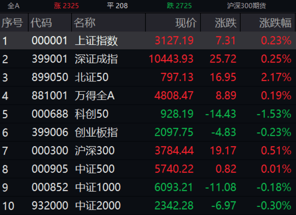 9月1日上午,大A股冲高回落。截至午间收盘,上证指数涨0.23%报3127.19点,深证成指涨0.25%,创业板指跌0.23%。2325只个股飘红,2725只飘绿,208只平盘,半日成交4822.3亿元。