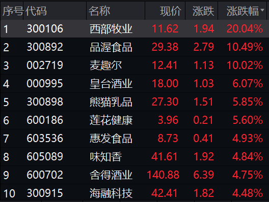 另外上午消费板块复苏,乳品、白酒指数走高。西部牧业拉出20CM涨停,麦趣尔涨停,皇台酒业、舍得酒业等涨超4%。
