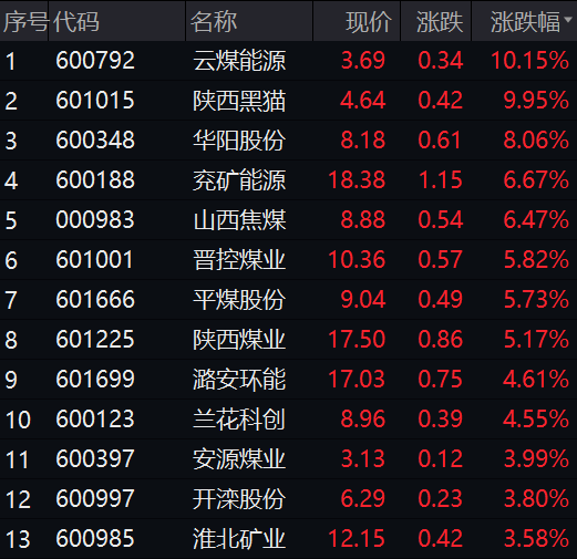 个股方面,上午云煤能源、陕西黑猫双双涨停,华阳股份、兖矿能源、山西焦煤、晋控煤业、平煤股份、陕西煤业等大涨超5%。