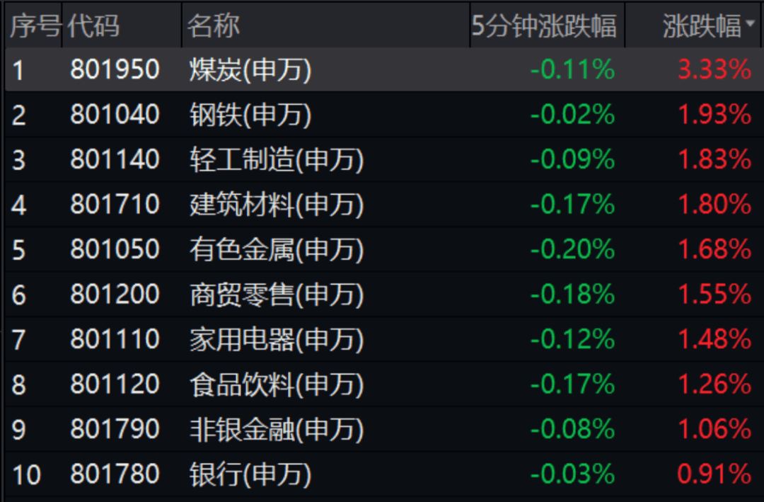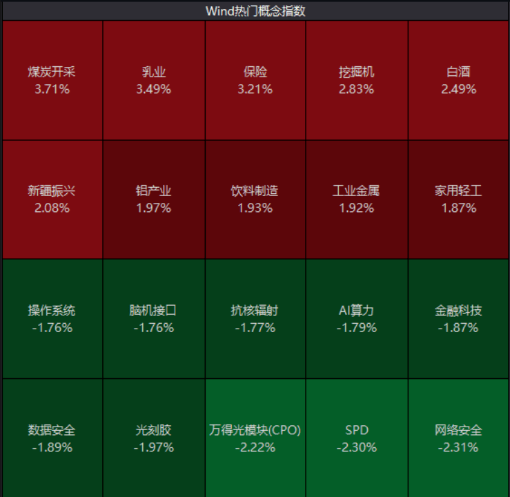 盘面上,煤炭、铝产业、轻工制造集体走高,大消费复苏,乳业、白酒表现优异,零售股涨幅居前;房地产高开低走,网络安全、光刻胶、CPO等概念走低。