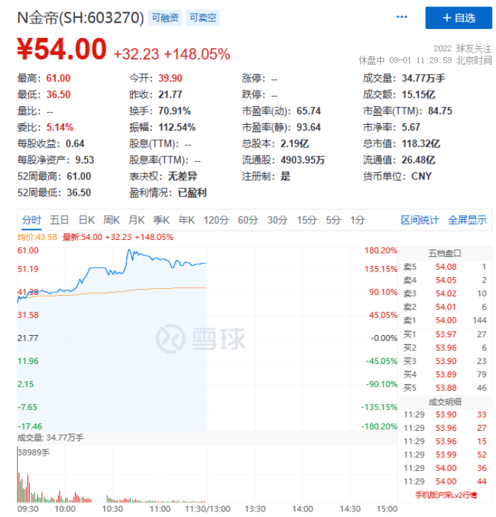 截至午间收盘,N金帝上午股价最高达到61元/股,与21.77元/股的发行价相比,中一签最高可赚得1.96万元。