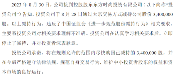 也是8月30日,东方时尚公告称,公司控股股东东方时尚投资有限公司(以下称“投资公司”)告知,之前投资公司大宗交易减持的行为,违反了《证监会进一步规范减持股份行为》相关要求,主要系投资公司对相关要求理解不准确。投资公司在认真学习相关要求后,立即停止了减持。投资公司承诺将在规则允许的范围内尽快购回已减持的340万股,并在今后严格遵守法律法规,规范自身交易行为。