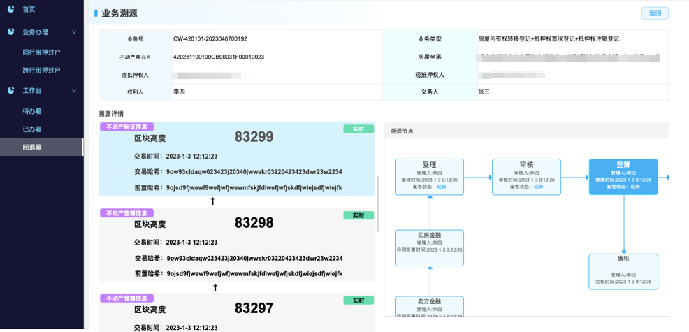 通过链上登记过程信息、业务协同信息等,将“带押过户”的各个环节、过程进行溯源监管,将多个部门数据根据业务环节进行关联展示,能够监管整个办理过程和业务状态,保障安全,并在此基础上提供证照核验、证照查询、证照示证、司法取证等服务。