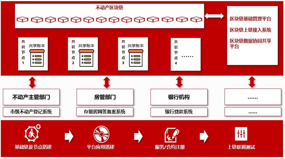 围绕建立区块链+不动产二手房“带押过户”的相关业务管理,建设区块链管理基础平台、区块链数据上链接入系统、区块链数据协同共享平台等,为不动产登记信息、交易信息、抵押信息上链共享提供安全、可信的基础环境,提供数据上链、查询及核验服务,为区块链+不动产登记信息共享服务体系提供基础支撑。