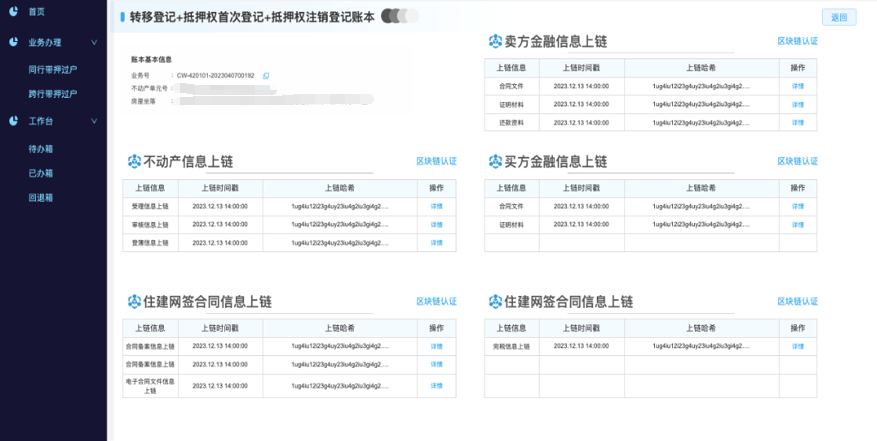 将申请表单、网签合同、证照信息、贷款材料信息等上链存储,利用区块链不可篡改的特性,保证链上数据存证可信。可以查看区块链上一账本数据情况,并提供基于区块链的查验服务,保障业务办理过程中的信息共享。