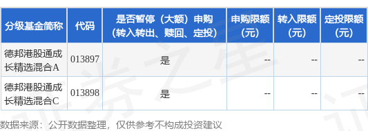 9月1日德邦基金管理有限公司发布《关于德邦港股通成长精选混合型证券投资基金因非港股通交易日暂停申购、赎回、转换和定期定额投资业务的公告》。公告中提示,为保障基金的平稳运作,维护基金份额持有人利益,自2023年9月1日起德邦港股通成长精选混合型证券投资基金因非港股通交易日暂停申购、赎回、转换和定期定额投资业务,下属分级基金调整明细如下: