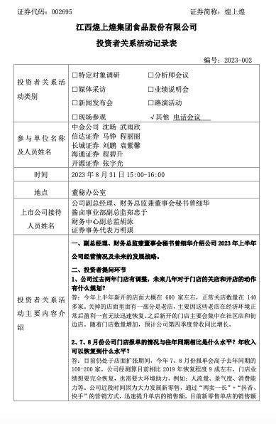 江西煌上煌集团食品股份有限公司(以下简称“煌上煌”或“公司”)9月1日发布公告称,公司于8月31日与多家机构投资者召开了电话会议。在会议上,煌上煌透露, 因今年5月前报单门店数量远低于去年同期,门店销售端预计全年增长大致在5%左右,下半年会高于去年同期。目前来看,营收增长在今年较难达到10%以上。