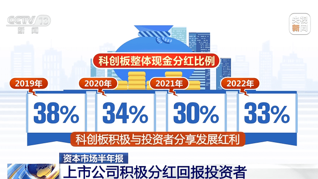 自开板以来,科创板累计现金分红达到945亿元,2019—2022年,科创板整体现金分红比例分别为38%、34%、30%和33%,均高于30%,科创板积极与投资者分享发展红利。