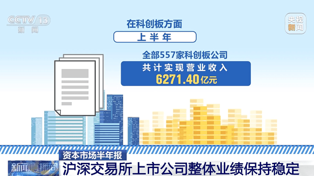 在科创板方面,上半年,全部557家科创板公司共计实现营业收入6271.40亿元,同比增长5%,其中,六成公司实现营业收入增长,72家公司增幅超过50%,两成公司营业收入超过10亿元。