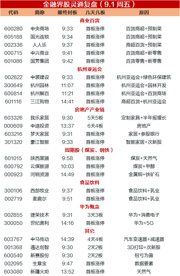 涨停梯队:中央商场(首板)、国光连锁(首板)、人人乐(首板)