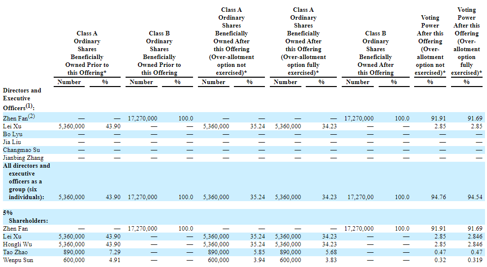 招股书显示,浩希的股票包括1221万股A类股票、1727万股的B类股票,合计共2948万股。在上市前的股东架构中: