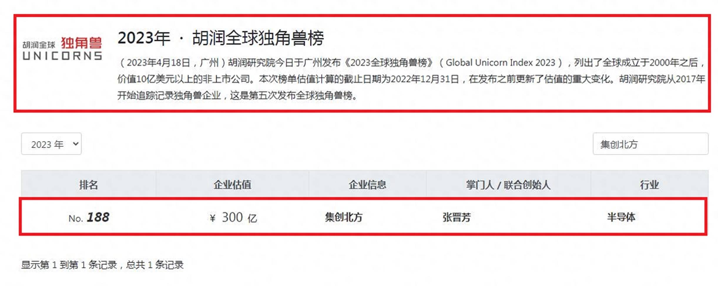 张晋芳的主要财富来源于集创北方(北京集创北方科技股份有限公司),这家企业在《2023全球独角兽榜》中排名第188位,估值达到了300亿元。