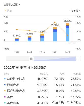 然后是其功效性护肤品业务增速下滑。这部分业务是华熙生物在2020年的时候取代了自己的玻尿酸原料业务,成为华熙生物营收第一的业务板块,且业务占比持续提升。
