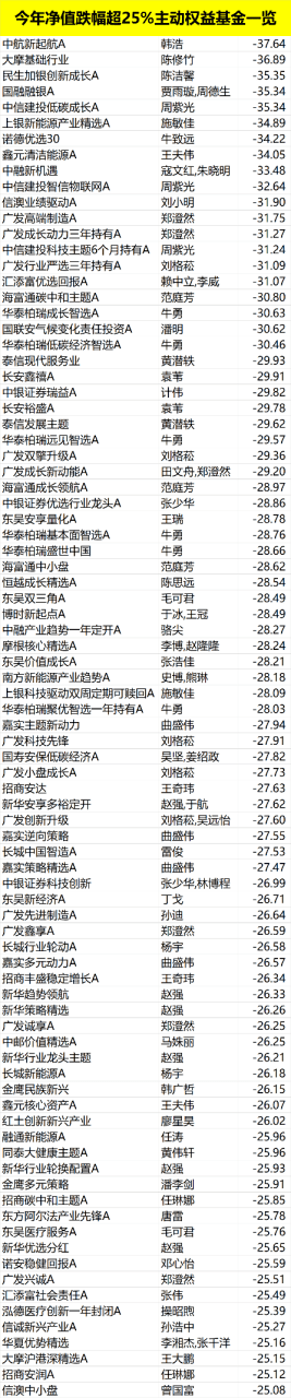 此外,今年基金净值跌幅大于25%的基金中,大多布局新能源、光伏等领域。